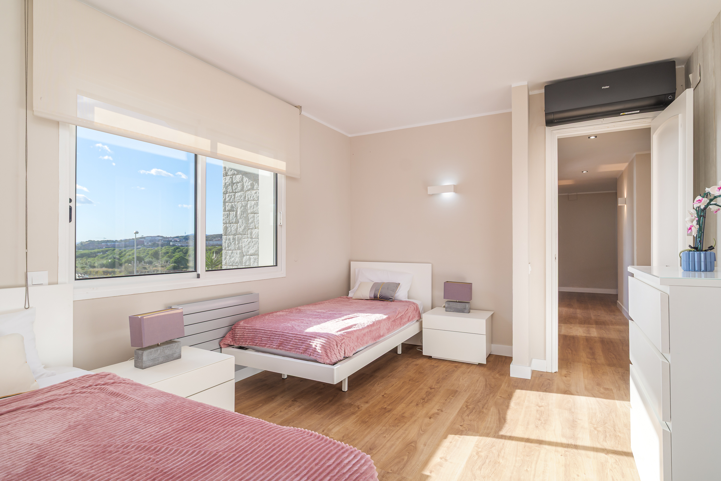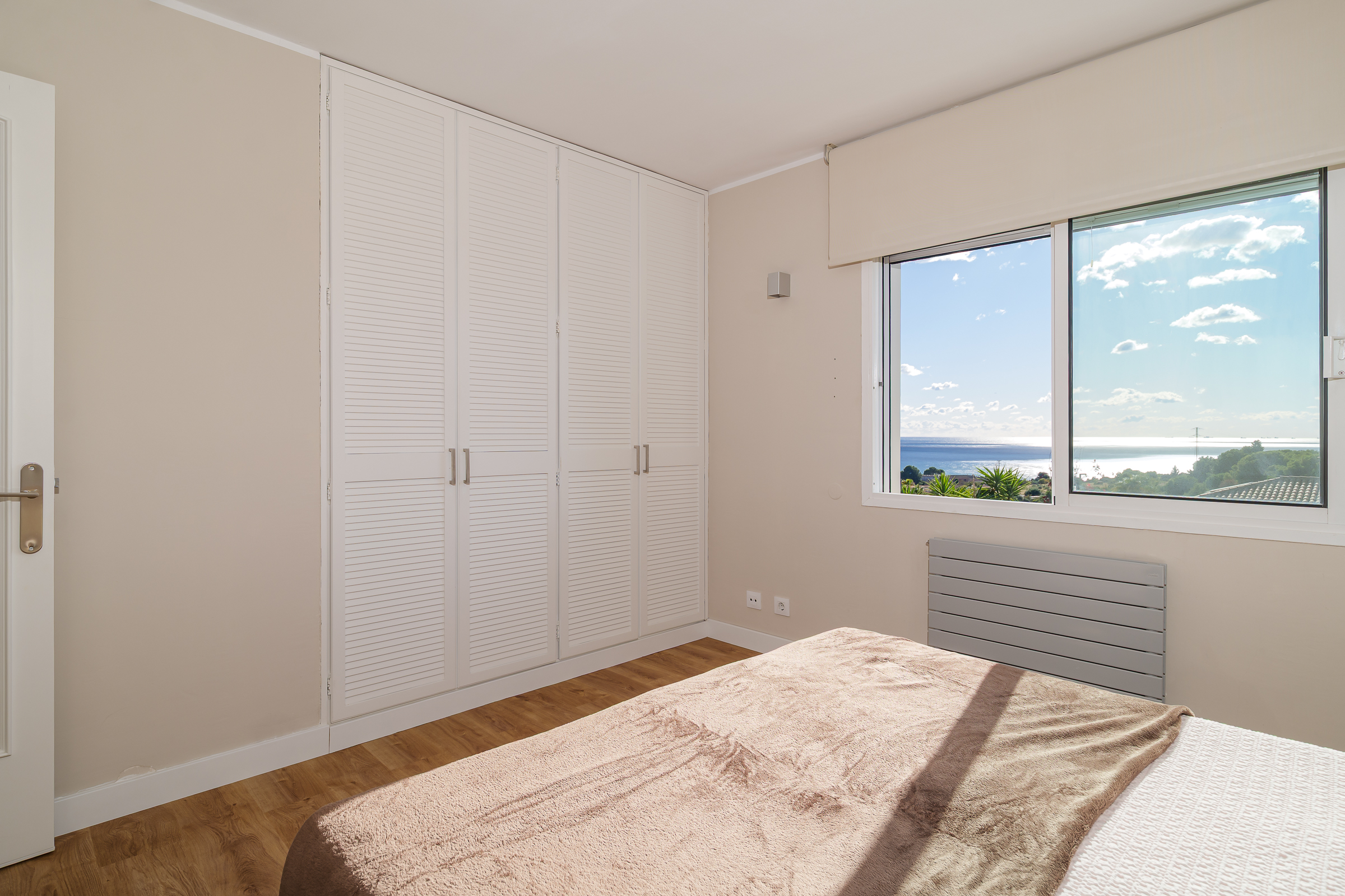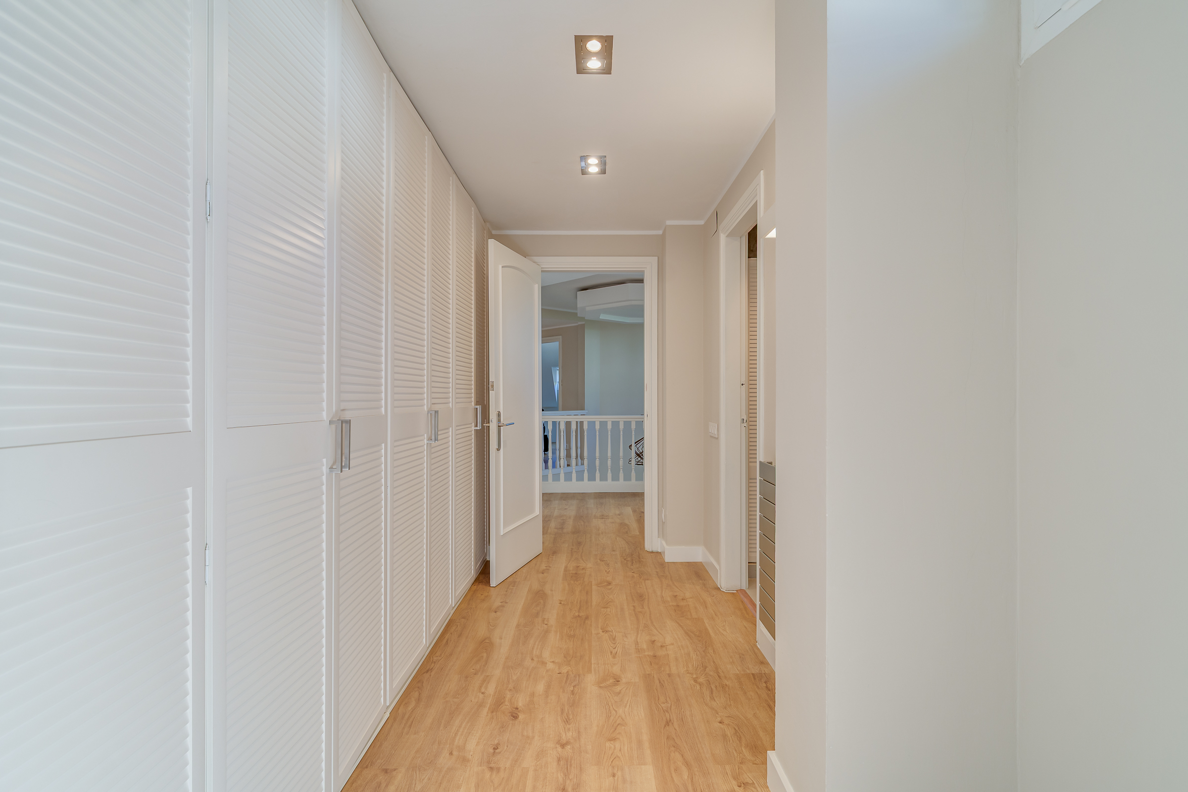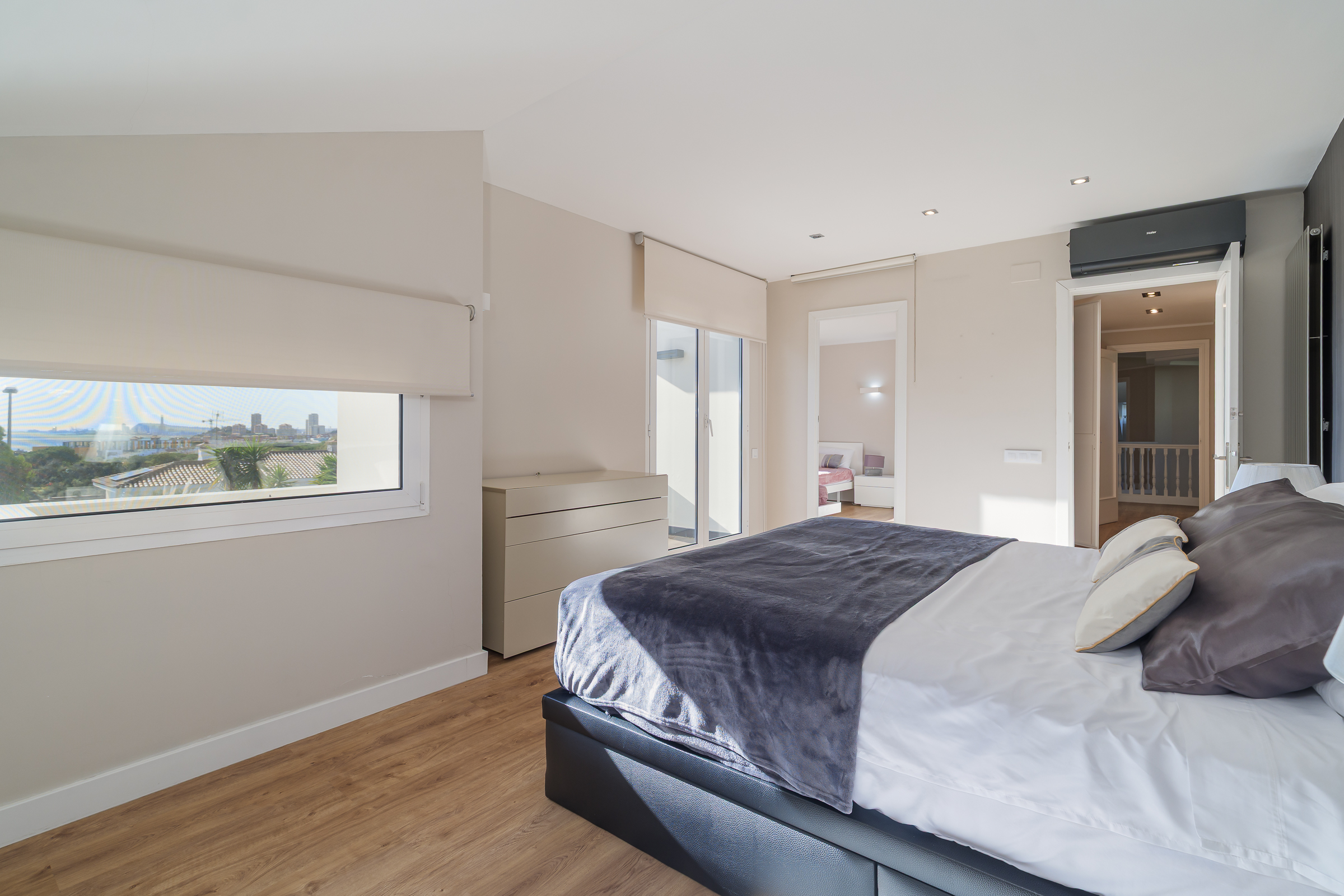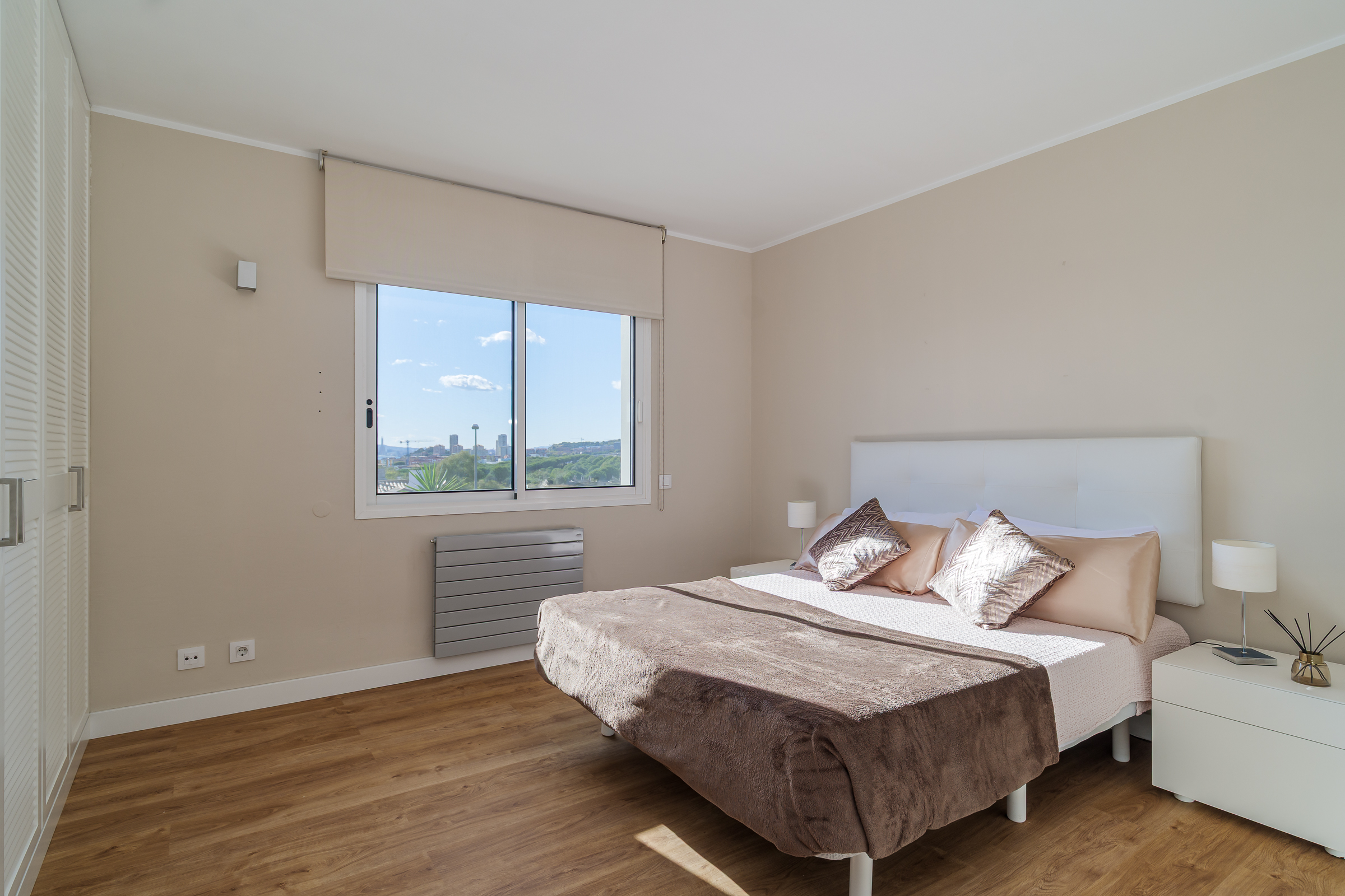 A través de una elegante escalinata accedemos a la primera planta, donde se ubican cuatro estancias: la suite principal, con baño privado, vestidor y balcón, y tres amplias habitaciones, una de ellas también con balcón. Desde todas las estancias se disfrutan vistas panorámicas al mar y a Barcelona. Esta planta dispone además de un segundo baño completo de diseño.