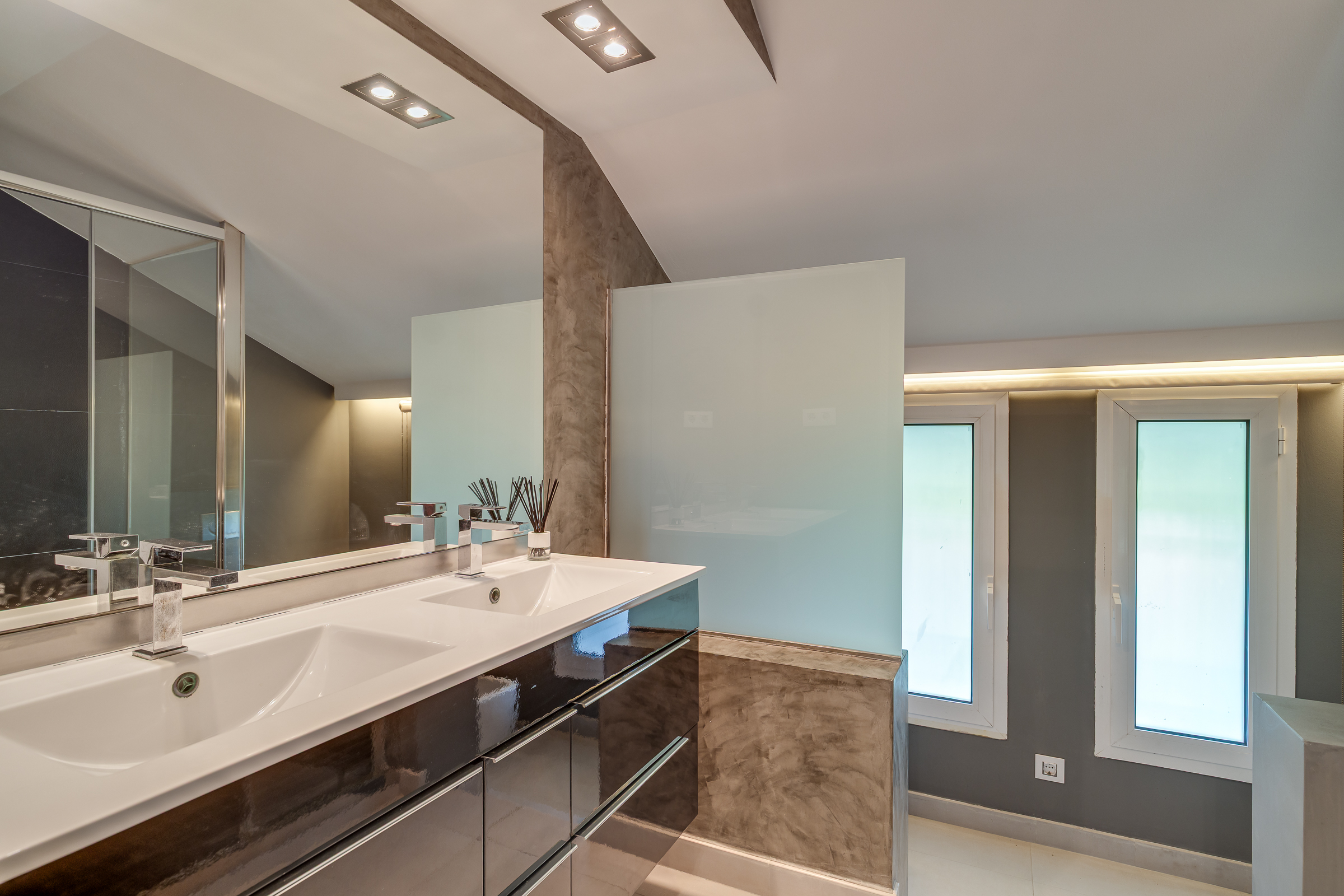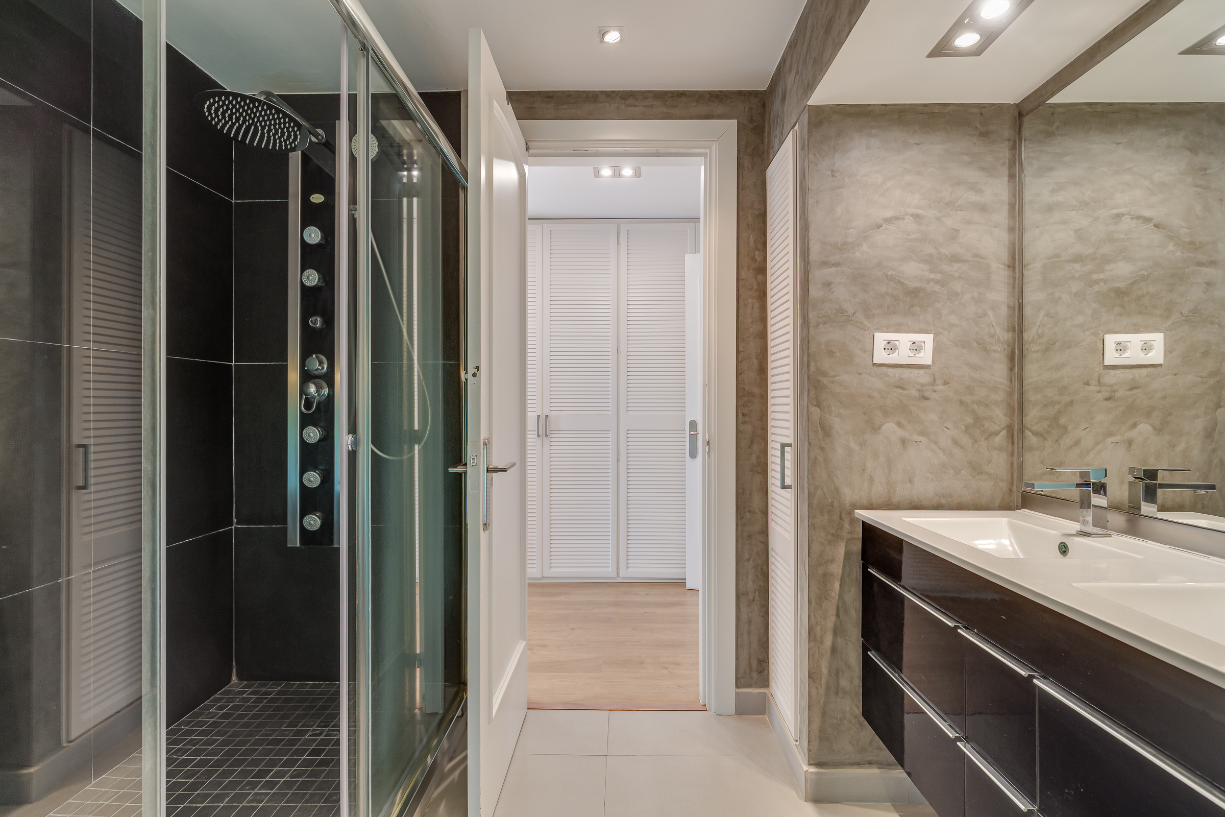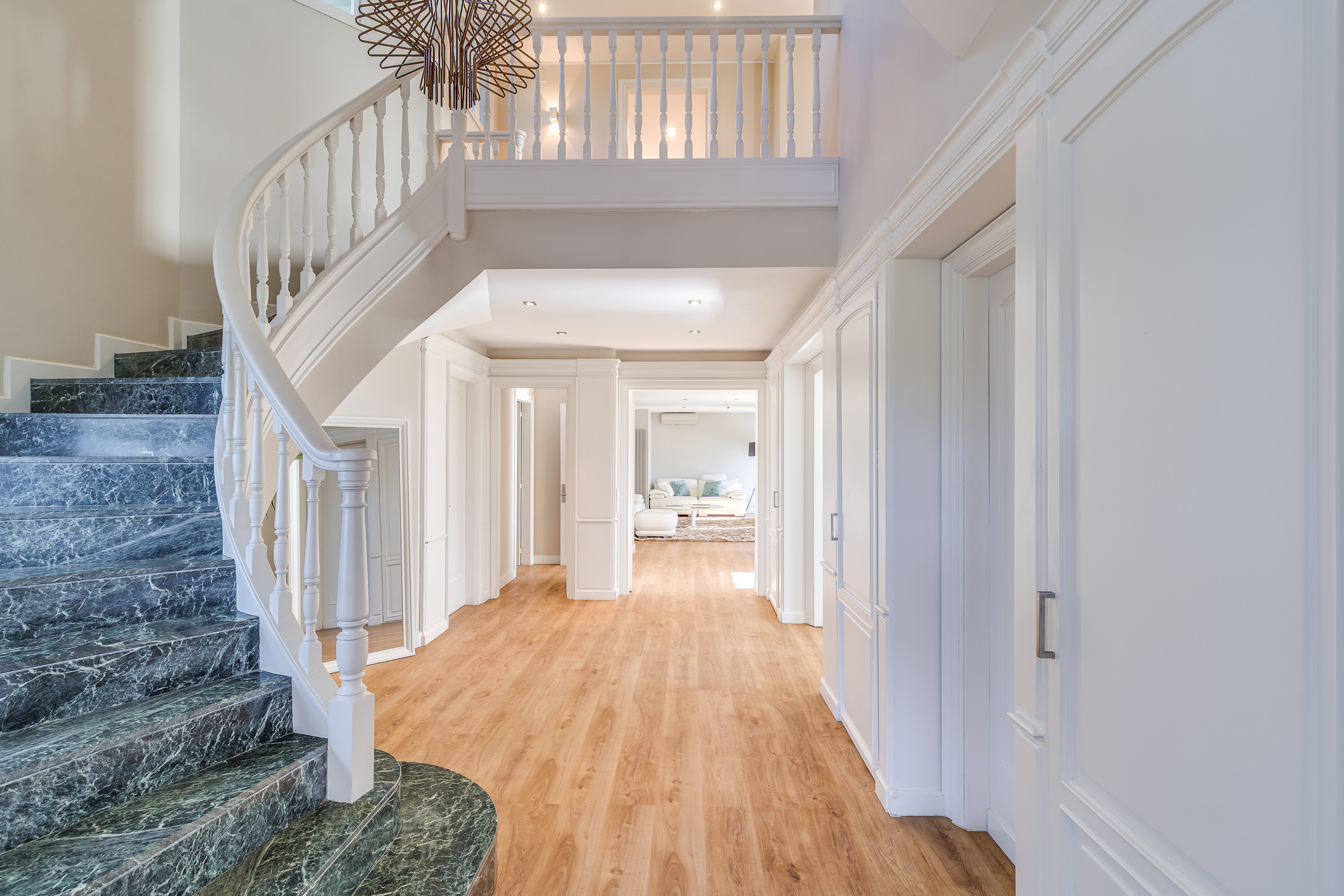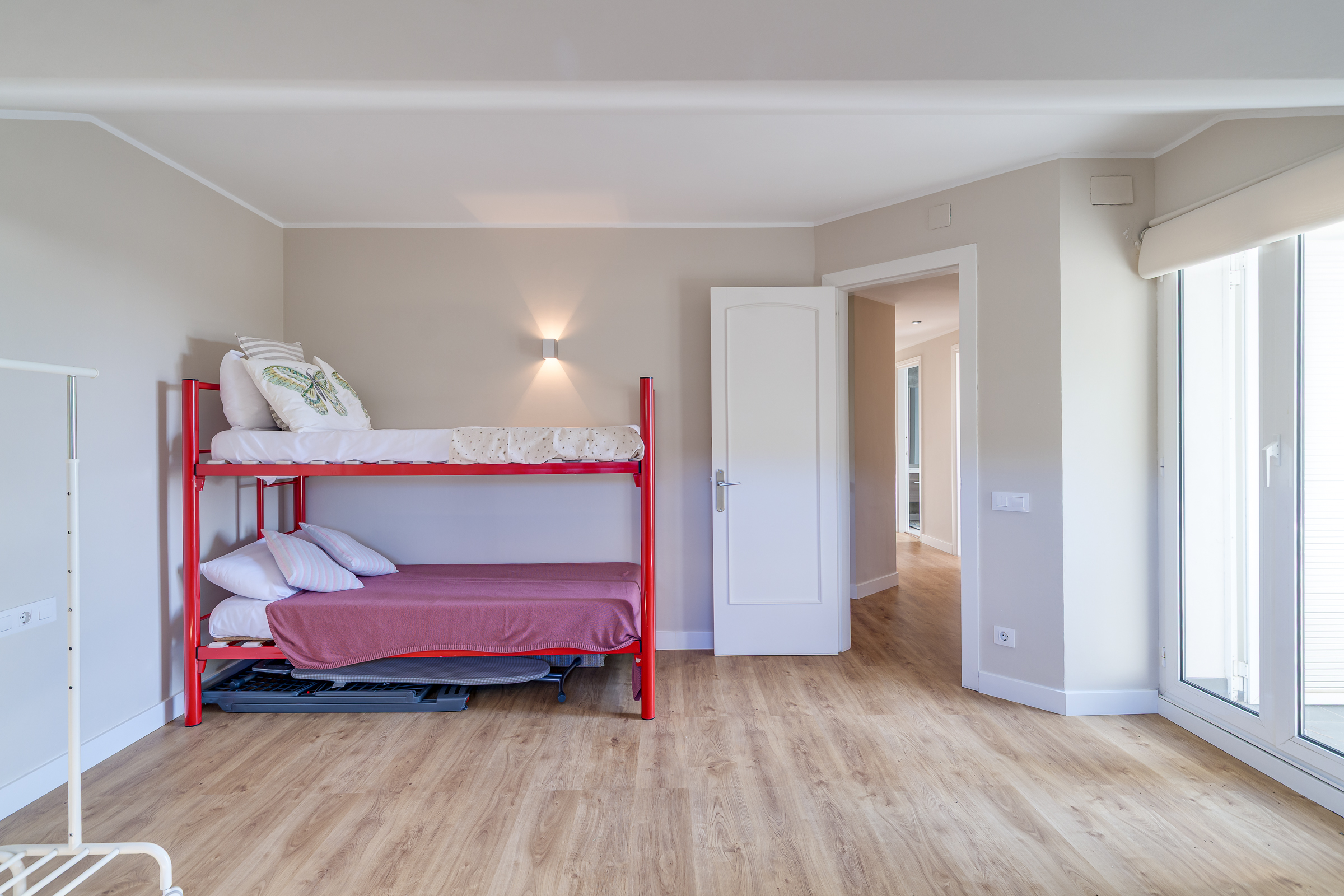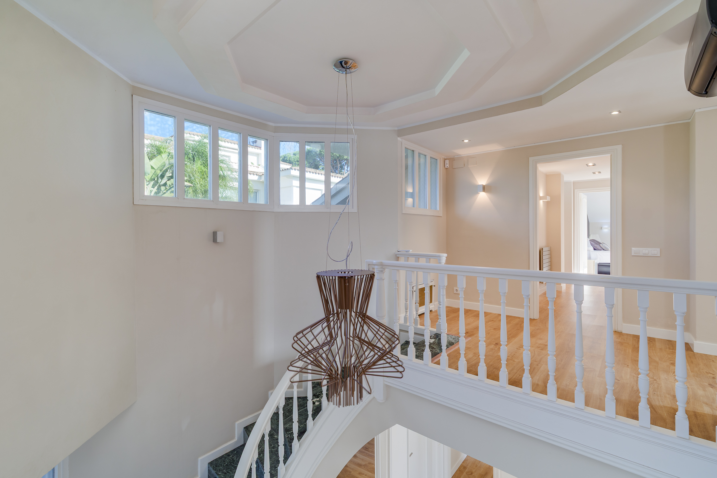 A través de una elegante escalinata accedemos a la primera planta, donde se ubican cuatro estancias: la suite principal, con baño privado, vestidor y balcón, y tres amplias habitaciones, una de ellas también con balcón. Desde todas las estancias se disfrutan vistas panorámicas al mar y a Barcelona. Esta planta dispone además de un segundo baño completo de diseño.