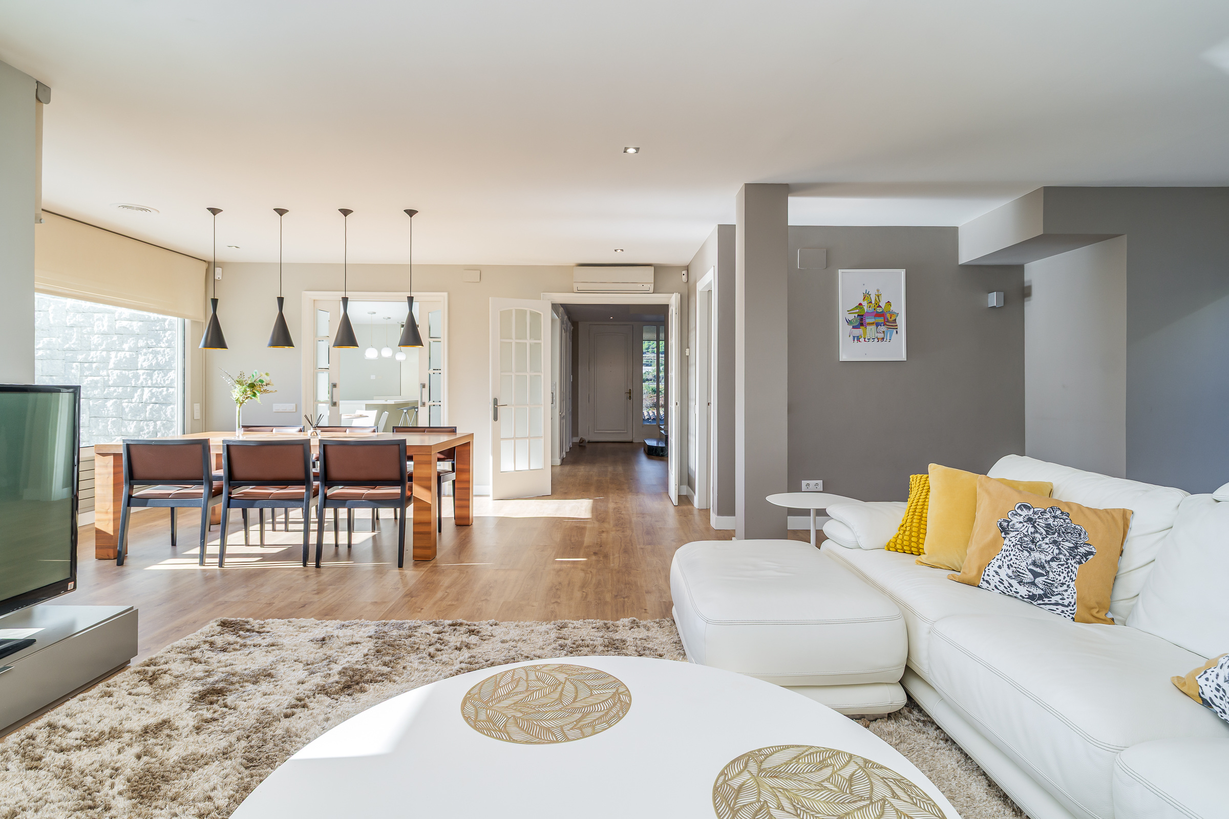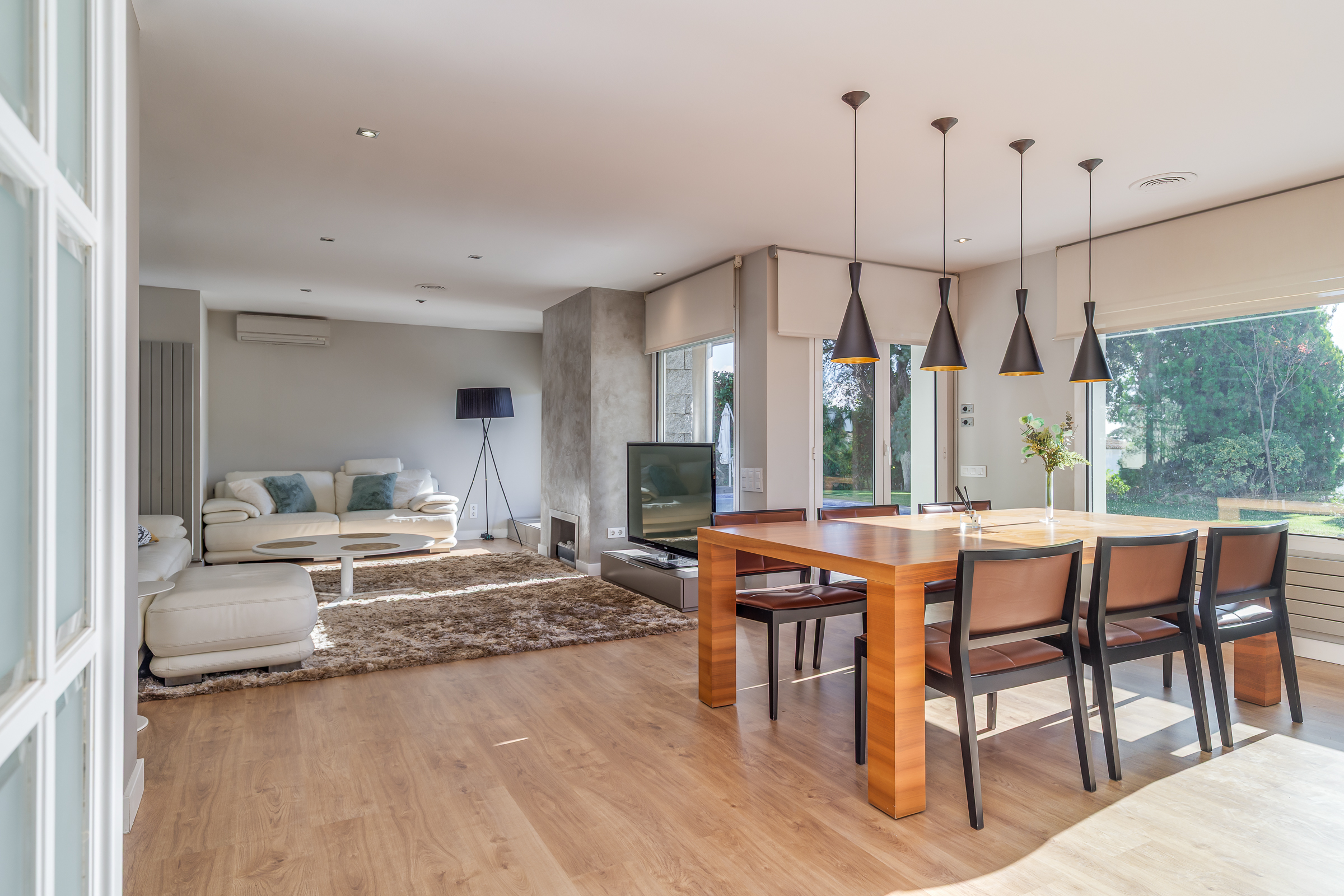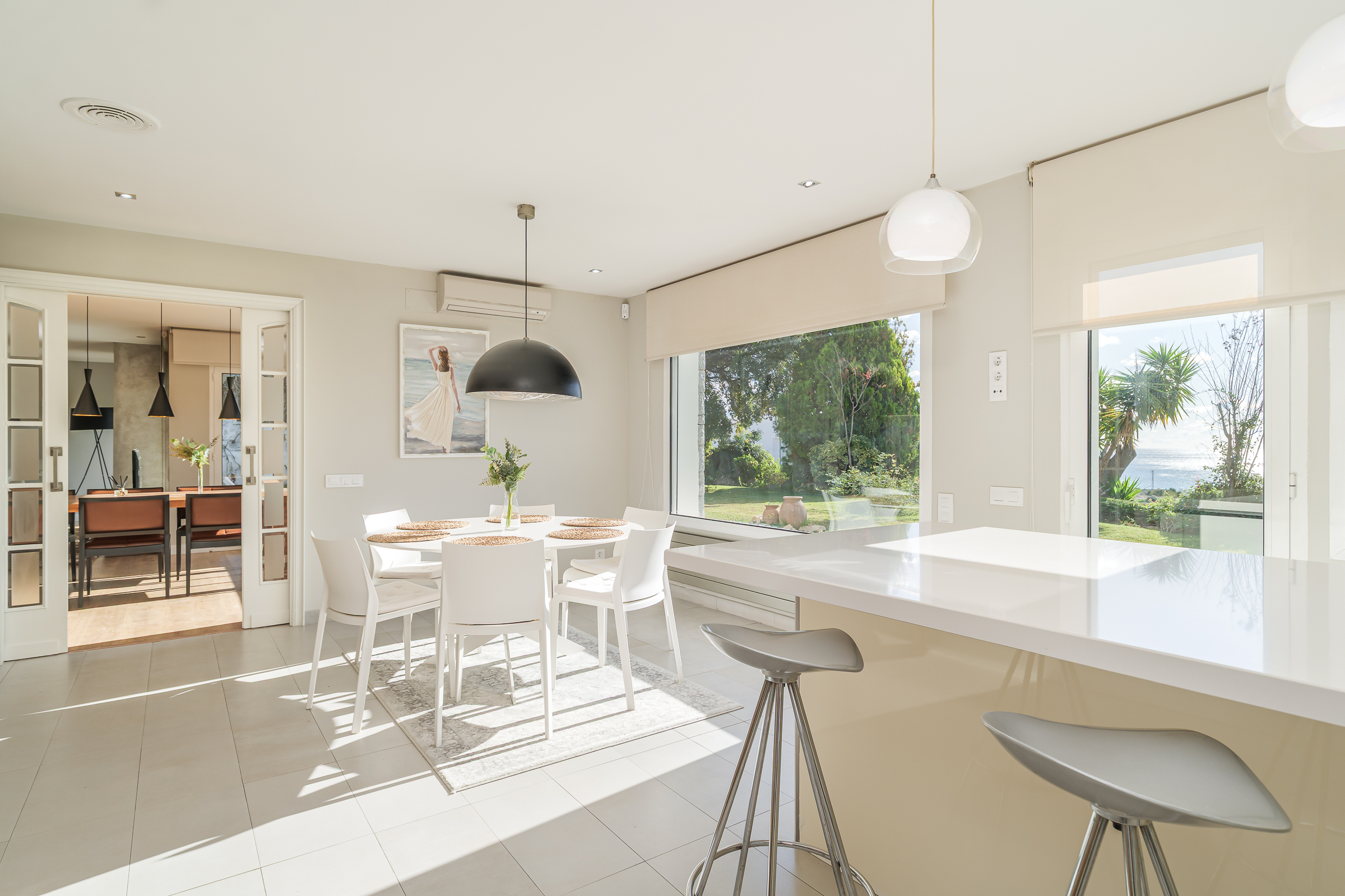 En la planta principal, un amplio y luminoso vestíbulo da la bienvenida y conduce al sofisticado salón-comedor, equipado con chimenea y con salida directa al jardín y a la acogedora zona chill out. La moderna cocina office, totalmente equipada, ofrece espacio, funcionalidad y unas preciosas vistas al jardín. En esta planta también encontramos un aseo de cortesía.